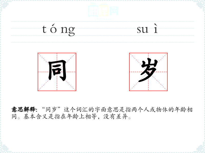 “同岁”这个词汇的字面意思是指两个人或物体的年龄相同。基本含义是指在年龄上相等,没有差异。