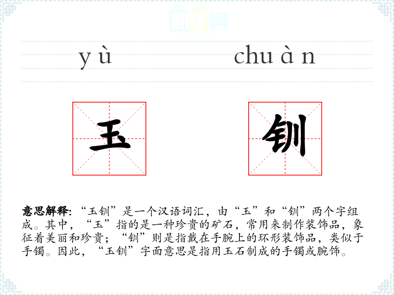 “玉钏”是一个汉语词汇,由“玉”和“钏”两个字组成。其中,“玉”指的是一种珍贵的矿石,常用来制作装饰品,象征着美丽和珍贵;“钏”则是指戴在手腕上的环形装饰品,类似于手镯。因此,“玉钏”字面意思是指用玉石制成的手镯或腕饰。