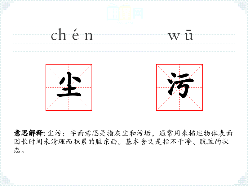 尘污:字面意思是指灰尘和污垢,通常用来描述物体表面因长时间未清理而积累的脏东西。基本含义是指不干净、肮脏的状态。