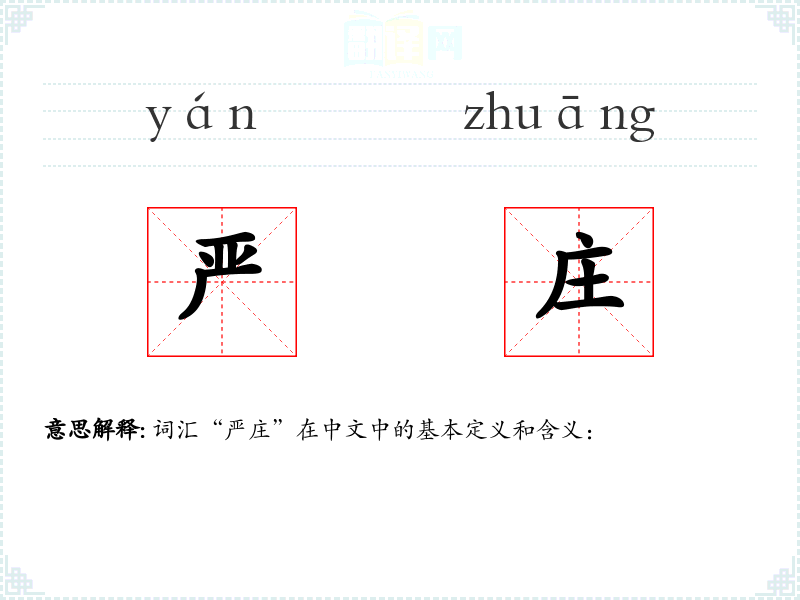 文化与社会背景: 在**文化中,“严庄”常与尊重传统、礼仪和秩序的价值观相联系。在官方或正式的社会活动中,保持“严庄”的态度被视为对场合的尊重。