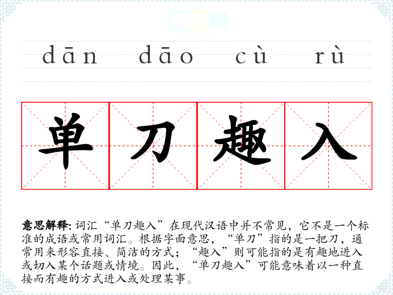 词汇“单刀趣入”在现代汉语中并不常见,它不是一个标准的成语或常用词汇。根据字面意思,“单刀”指的是一把刀,通常用来形容直接、简洁的方式;“趣入”则可能指的是有趣地进入或切入某个话题或情境。因此,“单刀趣入”可能意味着以一种直接而有趣的方式进入或处理某事。