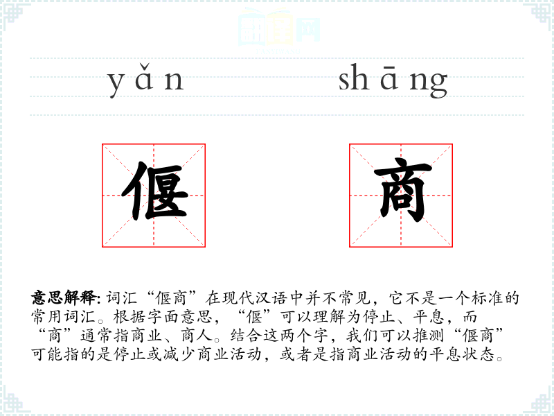 词汇“偃商”在现代汉语中并不常见,它不是一个标准的常用词汇。根据字面意思,“偃”可以理解为停止、平息,而“商”通常指商业、商人。结合这两个字,我们可以推测“偃商”可能指的是停止或减少商业活动,或者是指商业活动的平息状态。