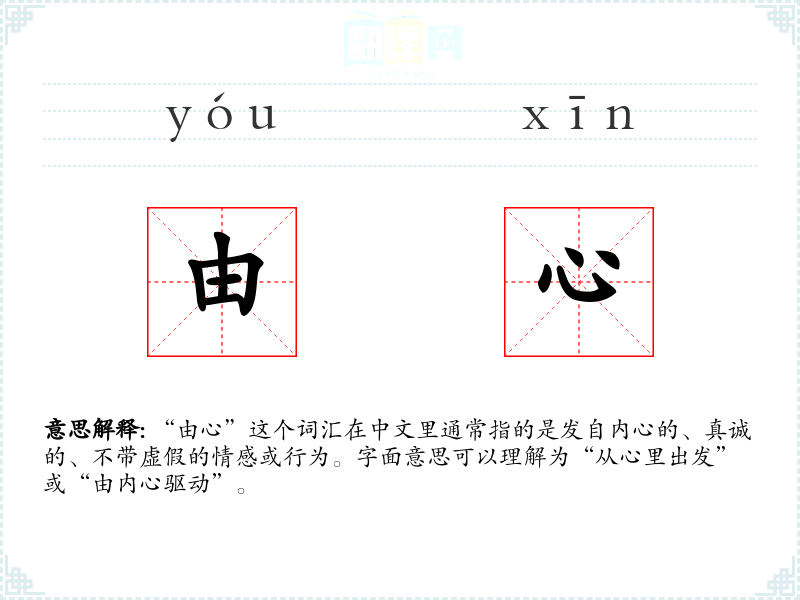 “由心”这个词汇在中文里通常指的是发自内心的、真诚的、不带虚假的情感或行为。字面意思可以理解为“从心里出发”或“由内心驱动”。