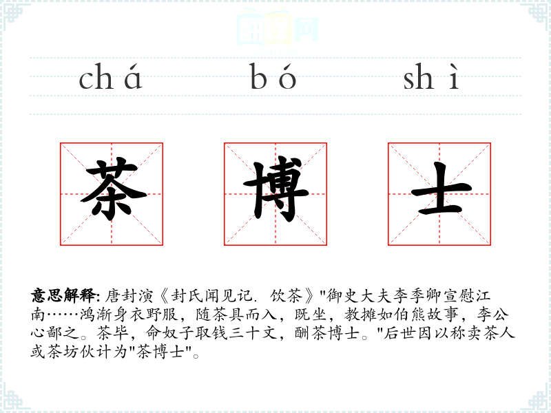 唐封演《封氏闻见记.饮茶》"御史大夫李季卿宣慰江南……鸿渐身衣野服,随茶具而入,既坐,教摊如伯熊故事,李公心鄙之。茶毕,命奴子取钱三十文,酬茶博士。"后世因以称卖茶人或茶坊伙计为"茶博士"。
