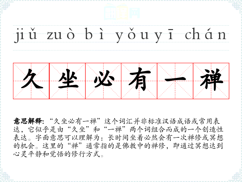 由于“久坐必有一禅”并非传统汉语词汇,它的词源和演变无从考证。它可能是现代人在追求心灵平静和健康生活方式的过程中创造出来的一个新表达。
