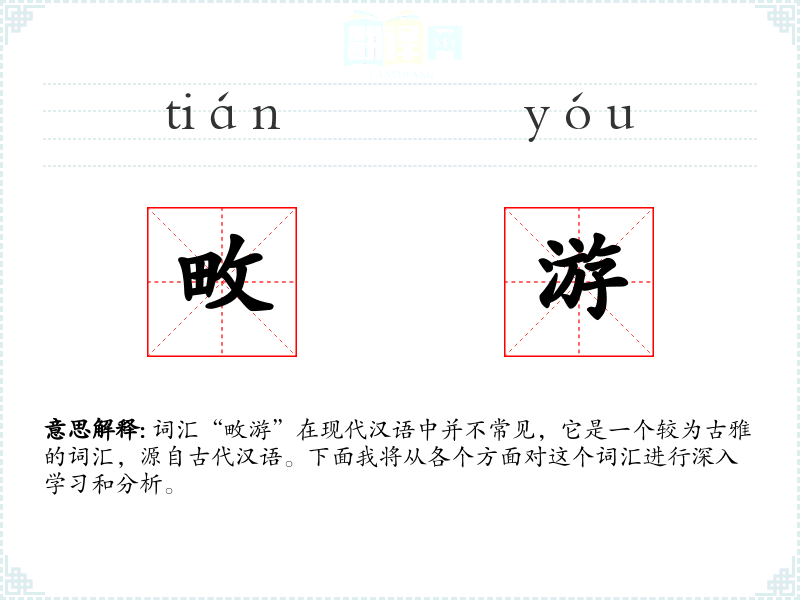 词汇“畋游”在现代汉语中并不常见,它是一个较为古雅的词汇,源自古代汉语。下面我将从各个方面对这个词汇进行深入学习和分析。