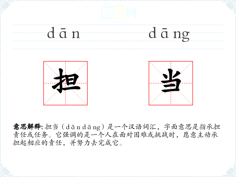 担当(dān dāng)是一个汉语词汇,字面意思是指承担责任或任务。它强调的是一个人在面对困难或挑战时,愿意主动承担起相应的责任,并努力去完成它。