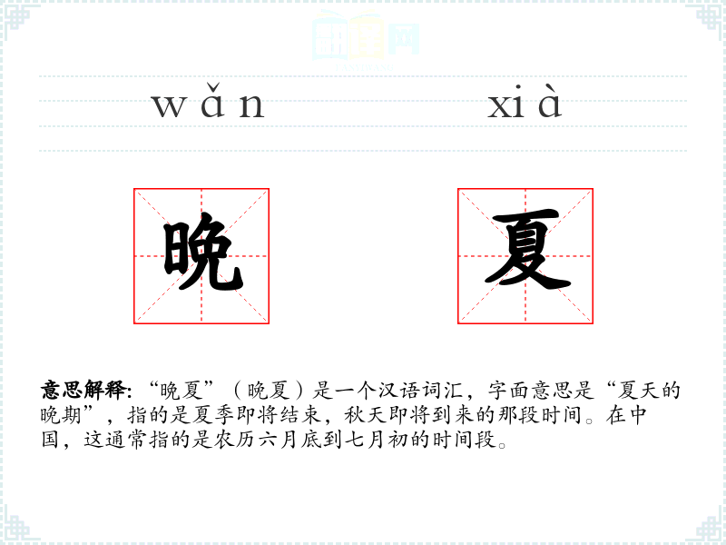 “晩夏”(晚夏)是一个汉语词汇,字面意思是“夏天的晚期”,指的是夏季即将结束,秋天即将到来的那段时间。在**,这通常指的是农历六月底到七月初的时间段。