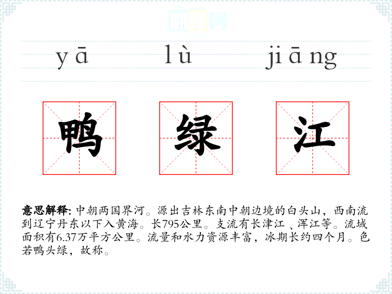 中朝两国界河。源出吉林东南中朝边境的白头山,西南流到辽宁丹东以下入黄海。长795公里。支流有长津江﹑浑江等。流域面积有6.37万平方公里。流量和水力资源丰富,冰期长约四个月。色若鸭头绿,故称。
