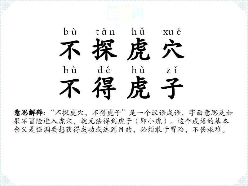 “不探虎穴,不得虎子”是一个汉语成语,字面意思是如果不冒险进入虎穴,就无法得到虎子(即小虎)。这个成语的基本含义是强调要想获得成功或达到目的,必须敢于冒险,不畏艰难。
