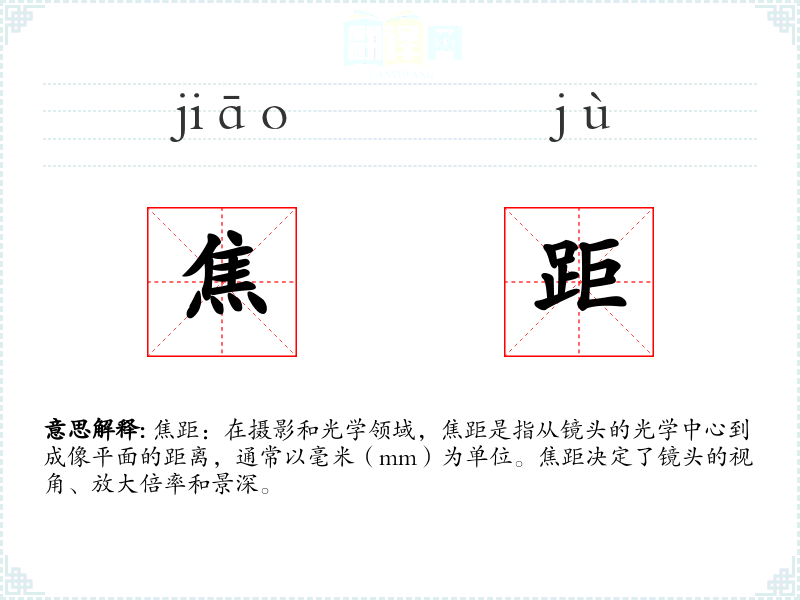 焦距:在摄影和光学领域,焦距是指从镜头的光学中心到成像平面的距离,通常以毫米(mm)为单位。焦距决定了镜头的视角、放大倍率和景深。