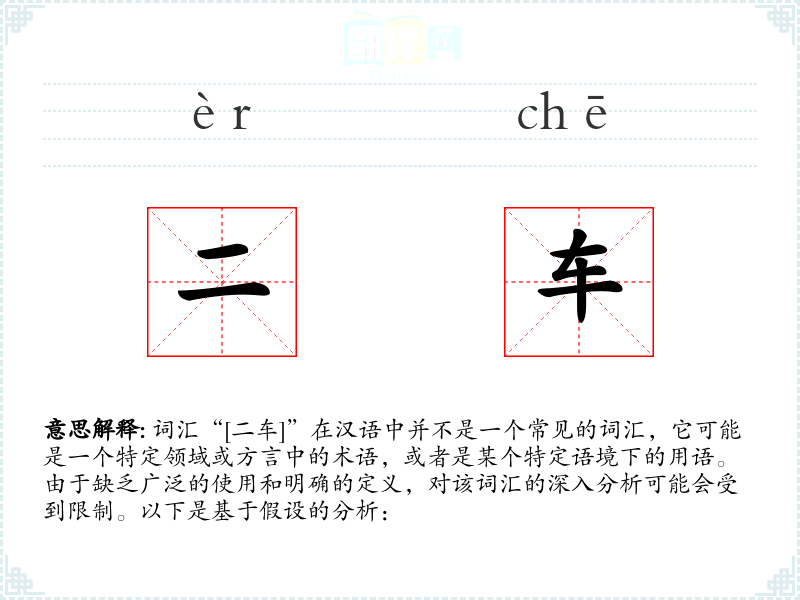 综上所述,由于“[二车]”不是一个标准汉语词汇,对其进行深入分析存在很大的困难。如果该词汇在特定的语境或领域中有明确的定义,那么上述分析可能会有所不同。