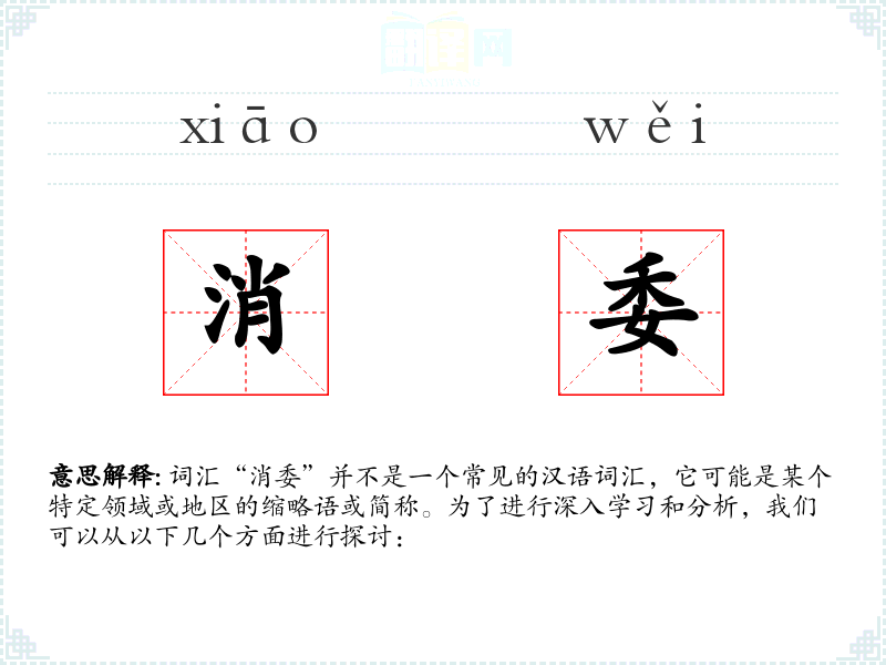 词汇“消委”并不是一个常见的汉语词汇,它可能是某个特定领域或地区的缩略语或简称。为了进行深入学习和分析,我们可以从以下几个方面进行探讨: