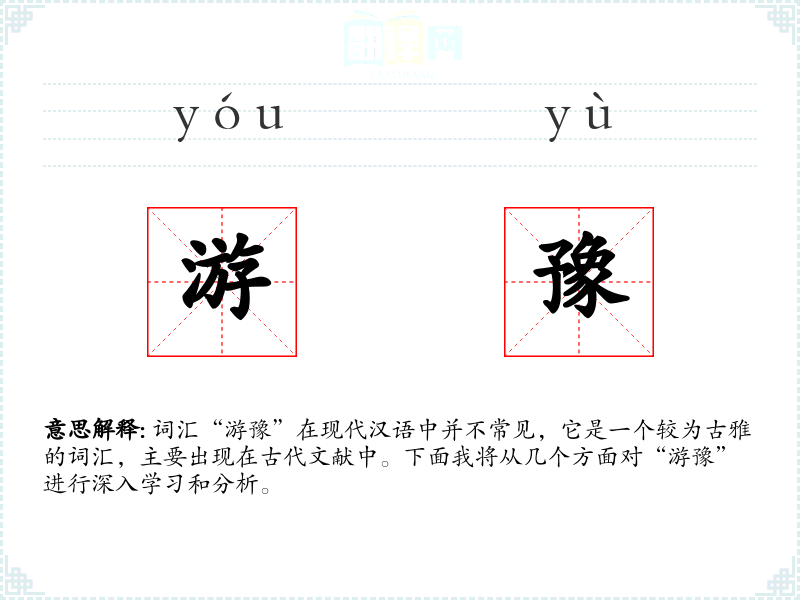 - 专业领域:在历史学或文学研究中,可能会用到“游豫”来描述古代人物的行为或心理状态。