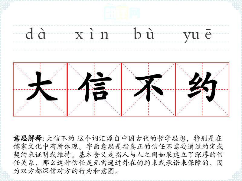 大信不约 的词源可以追溯到儒家经典,强调道德和伦理上的信任。随着时间的推移,这个概念被广泛应用于各种文化和社会关系中,强调信任的内在性和无需外在证明的特性。
