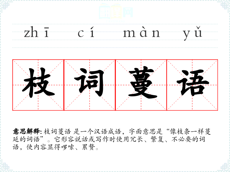 枝词蔓语 是一个汉语成语,字面意思是“像枝条一样蔓延的词语”。它形容说话或写作时使用冗长、繁复、不必要的词语,使内容显得啰嗦、累赘。