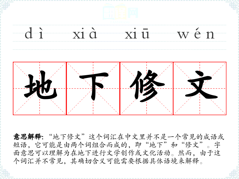 由于“地下修文”不是一个标准词汇,它的词源和演变可能没有明确的历史记录。它可能是现代文学或文化讨论中创造的一个新词,用以描述特定情境下的文学活动。