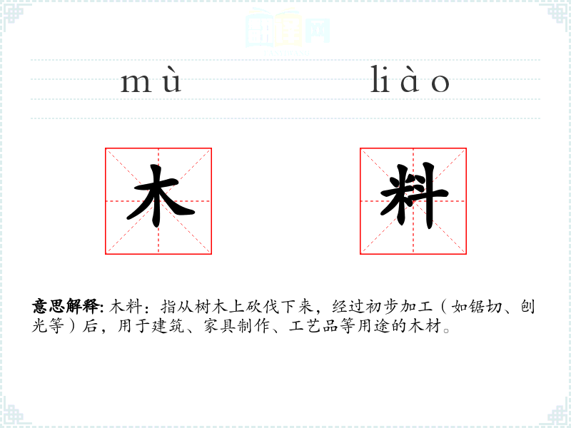 - 专业领域:在建筑或木工行业,木料的种类、质量和处理方式是讨论的重点,如“这种硬木料非常适合制作地板。”