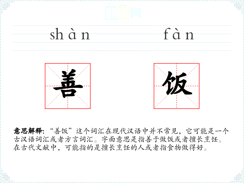 “善饭”这个词汇在现代汉语中并不常见,它可能是一个古汉语词汇或者方言词汇。字面意思是指善于做饭或者擅长烹饪。在古代文献中,可能指的是擅长烹饪的人或者指食物做得好。
