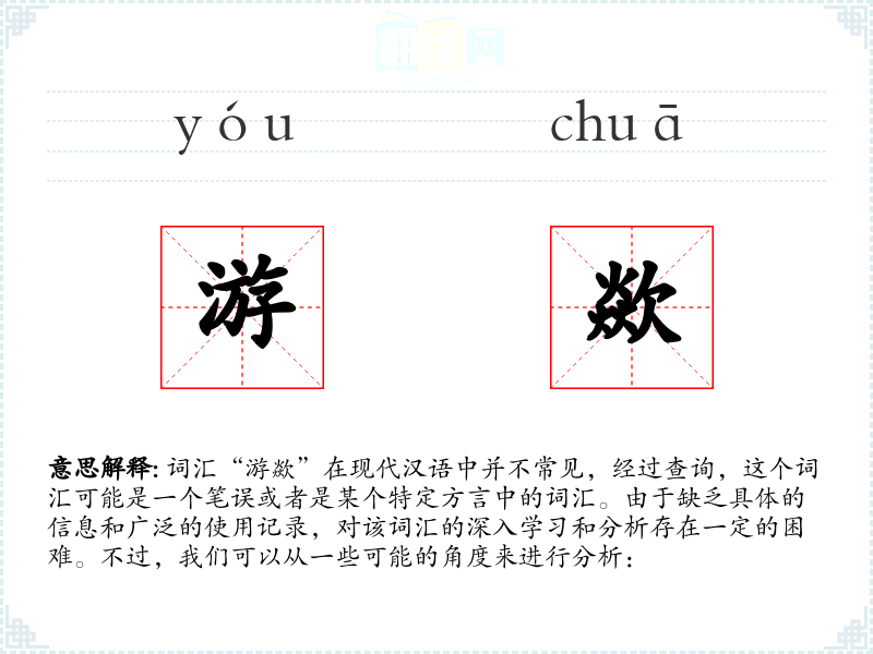 综上所述,由于“游歘”不是一个已知的标准汉语词汇,我们无法对其进行深入的学习和分析。如果这是一个特定方言中的词汇,可能需要更多的上下文信息和具体的使用实例才能进行有效的分析。