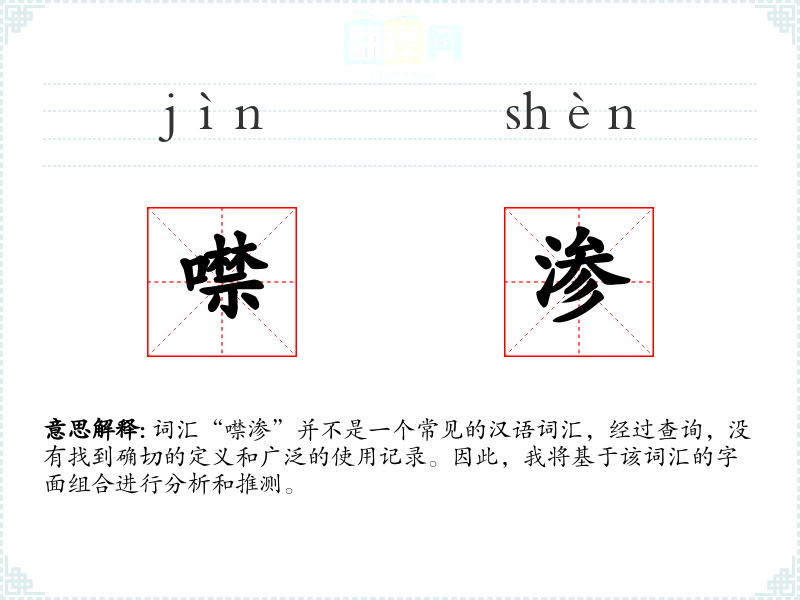 “噤”字通常指闭口不说话,如“噤声”;“渗”字则常指液体慢慢地透过或漏出,如“渗水”。将两个字组合在一起,“噤渗”可能指的是某种形式的沉默或抑制,类似于液体渗透的过程,可能比喻信息或情感的缓慢泄露或抑制。