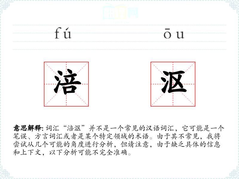 词汇“涪沤”并不是一个常见的汉语词汇,它可能是一个笔误、方言词汇或者是某个特定领域的术语。由于其不常见,我将尝试从几个可能的角度进行分析,但请注意,由于缺乏具体的信息和上下文,以下分析可能不完全准确。