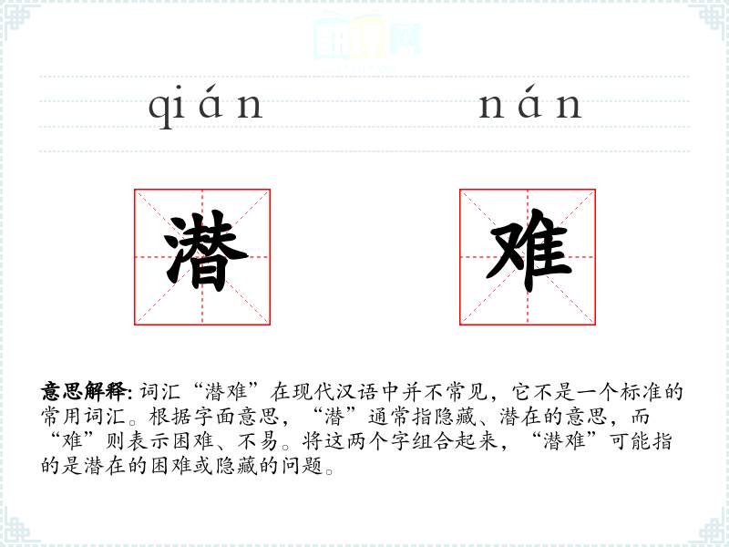 由于“潜难”不是一个常用词汇,其词源和演变不太明确。它可能是由“潜”和“难”两个常用词汇组合而成的新词,用以描述特定情境下的问题。