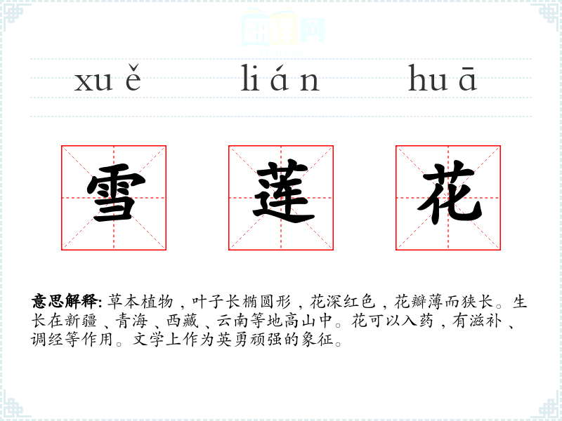 草本植物﹐叶子长椭圆形﹐花深红色﹐花瓣薄而狭长。生长在新疆﹑青海﹑西藏﹑云南等地高山中。花可以入药﹐有滋补﹑调经等作用。文学上作为