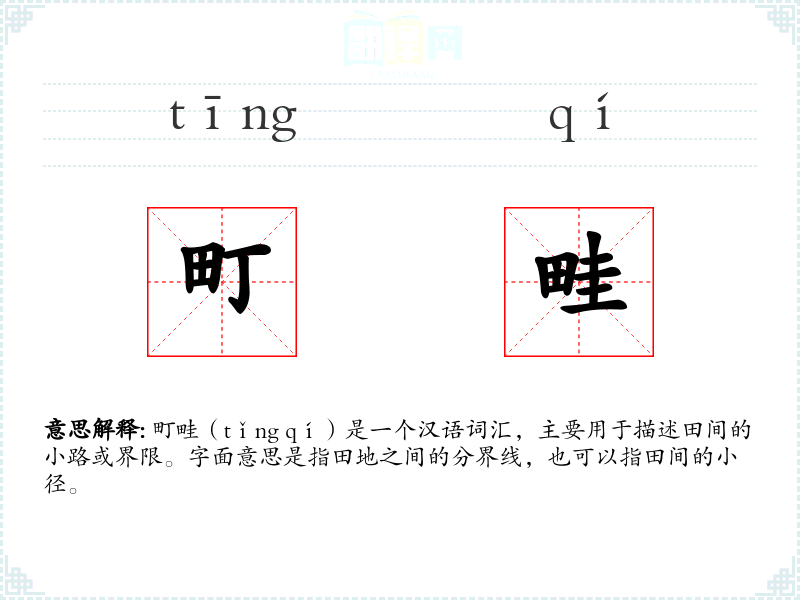 町畦(tǐng qí)是一个汉语词汇,主要用于描述田间的小路或界限。字面意思是指田地之间的分界线,也可以指田间的小径。