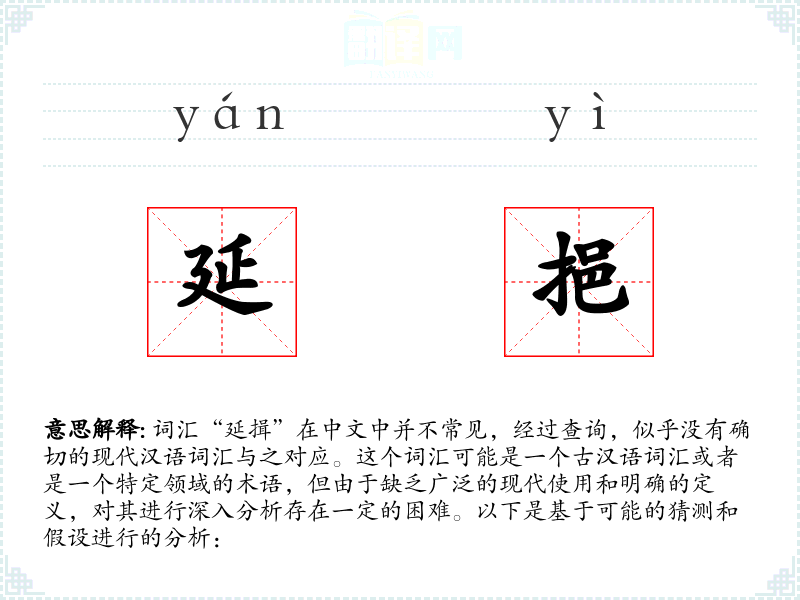 词汇“延揖”在中文中并不常见,经过查询,似乎没有确切的现代汉语词汇与之对应。这个词汇可能是一个古汉语词汇或者是一个特定领域的术语,但由于缺乏广泛的现代使用和明确的定义,对其进行深入分析存在一定的困难。以下是基于可能的猜测和假设进行的分析: