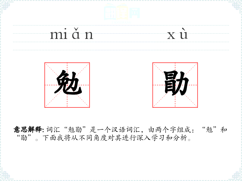 “勉”字最早见于《说文解字》,意为努力;“勖”字则较晚出现,源自《诗经》,意为勉励。两者结合形成“勉勖”,强调的是通过鼓励来促使努力。