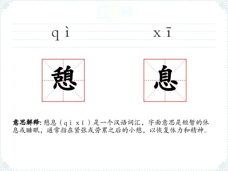 憩息(qì xī)是一个汉语词汇,字面意思是短暂的休息或睡眠,通常指在紧张或劳累之后的小憩,以恢复体力和精神。
