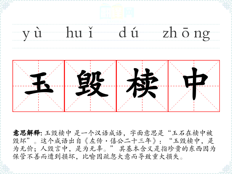 玉毁椟中 是一个汉语成语,字面意思是“玉石在椟中被毁坏”。这个成语出自《左传·僖公二十三年》:“玉毁椟中,是为无价;人毁言中,是为无辜。” 其基本含义是指珍贵的东西因为保管不善而遭到损坏,比喻因疏忽大意而导致重大损失。
