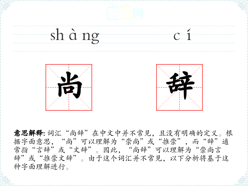 词汇“尚辞”在中文中并不常见,且没有明确的定义。根据字面意思,“尚”可以理解为“崇尚”或“推崇”,而“辞”通常指“言辞”或“文辞”。因此,“尚辞”可以理解为“崇尚言辞”或“推崇文辞”。由于这个词汇并不常见,以下分析将基于这种字面理解进行。