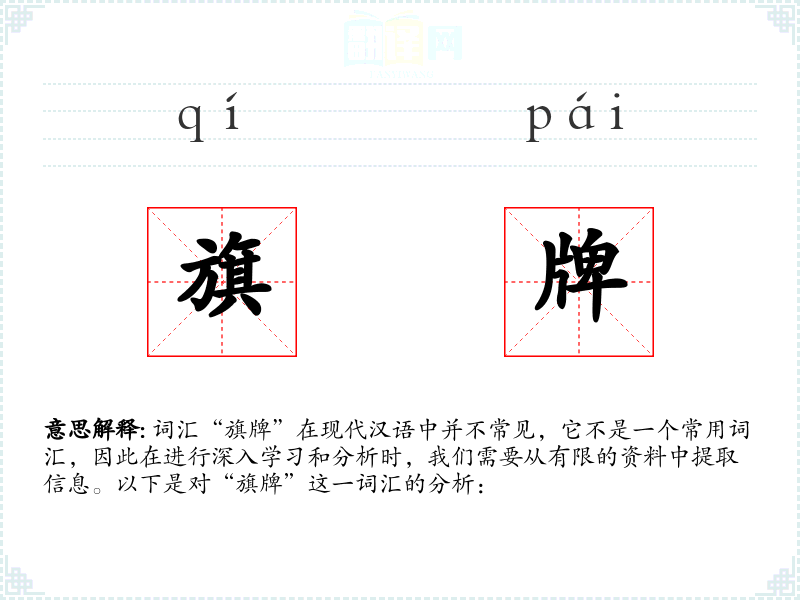 - 反义词:无(由于“旗牌”不常用,反义词不明显)