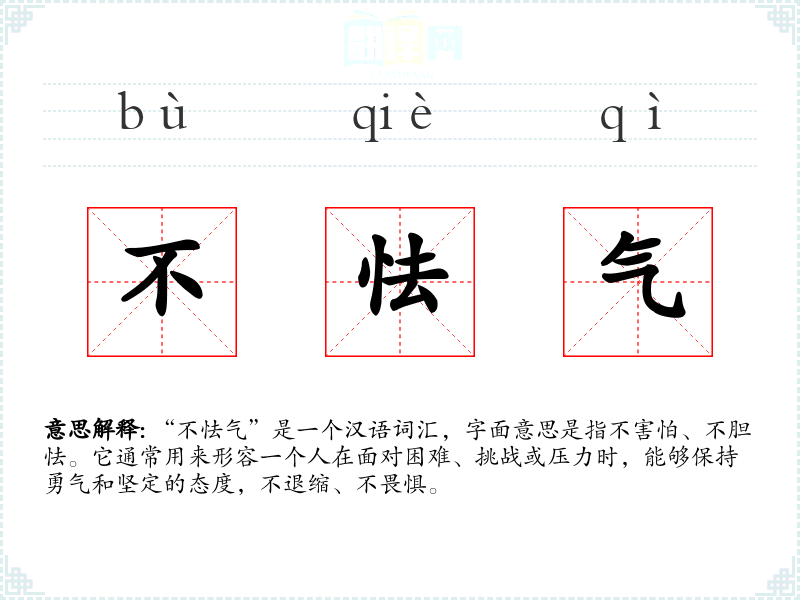 “不怯气”是一个汉语词汇,字面意思是指不害怕、不胆怯。它通常用来形容一个人在面对困难、挑战或压力时,能够保持勇气和坚定的态度,不退缩、不畏惧。