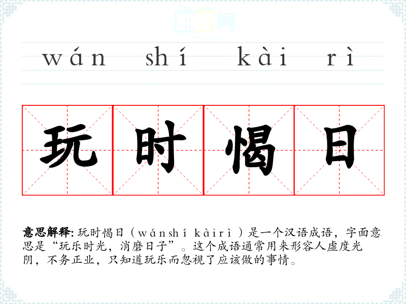 玩时愒日(wán shí kài rì)是一个汉语成语,字面意思是“玩乐时光,消磨日子”。这个成语通常用来形容人虚度光阴,不务正业,只知道玩乐而忽视了应该做的事情。