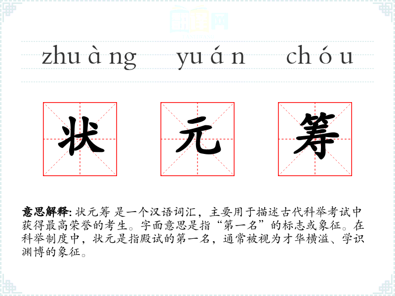 状元筹 是一个汉语词汇,主要用于描述古代科举考试中获得最高荣誉的考生。字面意思是指“第一名”的标志或象征。在科举制度中,状元是指殿试的第一名,通常被视为才华横溢、学识渊博的象征。