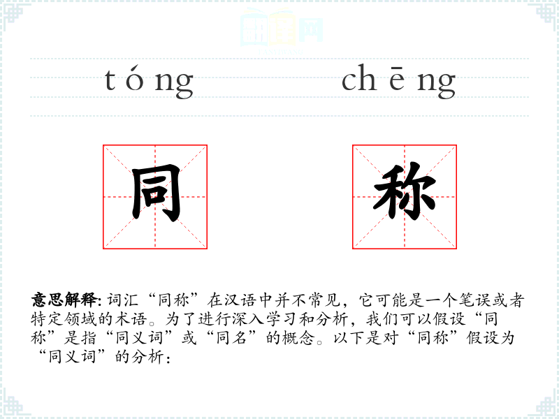 词汇“同称”在汉语中并不常见,它可能是一个笔误或者特定领域的术语。为了进行深入学习和分析,我们可以假设“同称”是指“同义词”或“同名”的概念。以下是对“同称”假设为“同义词”的分析: