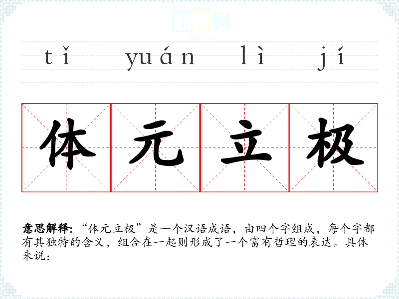 “体元立极”是一个汉语成语,由四个字组成,每个字都有其独特的含义,组合在一起则形成了一个富有哲理的表达。具体来说: