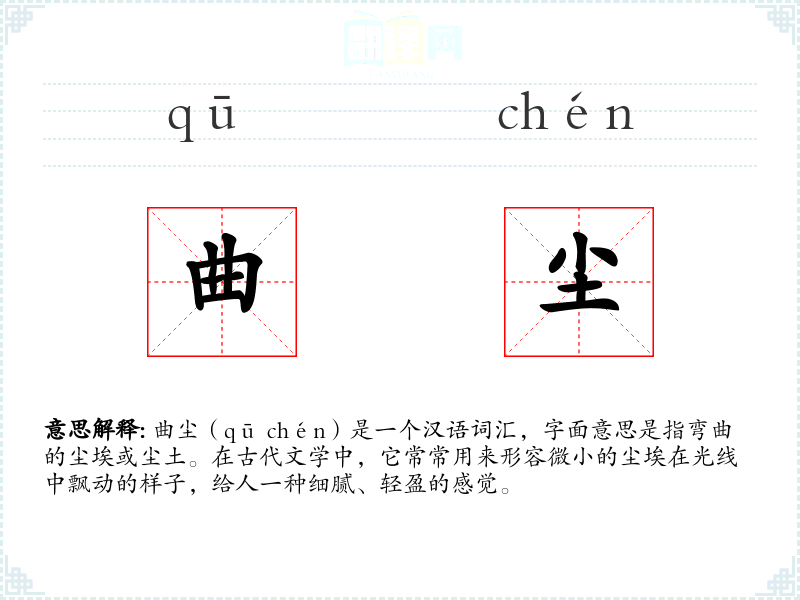 曲尘(qū chén)是一个汉语词汇,字面意思是指弯曲的尘埃或尘土。在古代文学中,它常常用来形容微小的尘埃在光线中飘动的样子,给人一种细腻、轻盈的感觉。