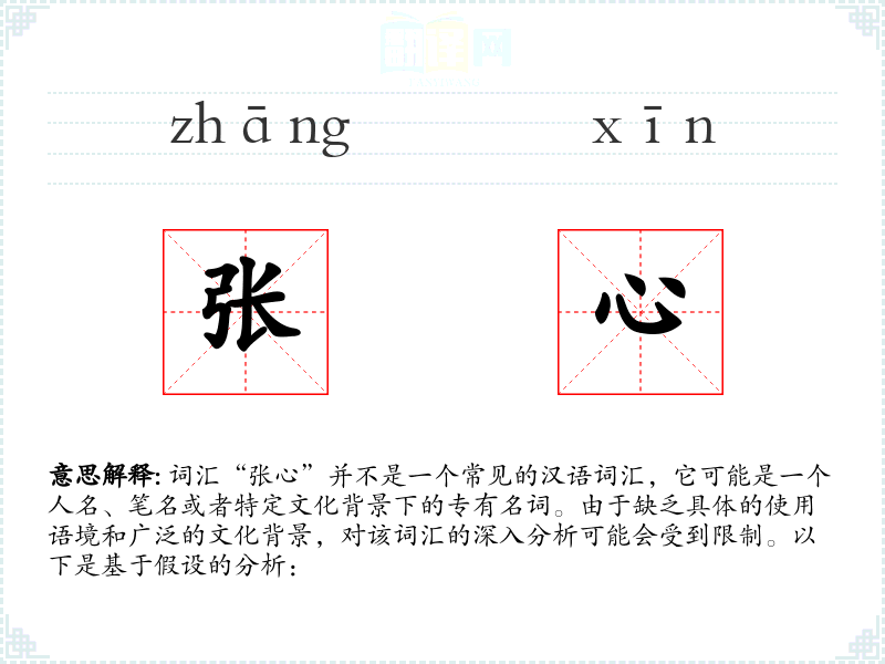 - 对于“张心”这个词汇的理解,需要更多的上下文信息。在语言学习和表达中,了解词汇的具体使用环境和文化背景是非常重要的。