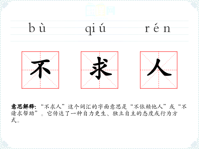 “不求人”这个词汇的字面意思是“不依赖他人”或“不请求帮助”。它传达了一种自力更生、独立自主的态度或行为方式。