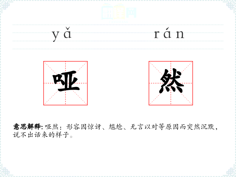 - 文学:在文学作品中,“哑然”常用来描绘人物在某种情境下的心理状态,如惊讶、困惑或尴尬。