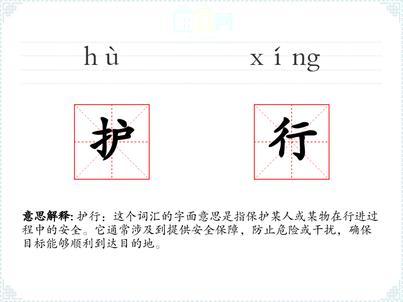 护行:这个词汇的字面意思是指保护某人或某物在行进过程中的安全。它通常涉及到提供安全保障,防止危险或干扰,确保目标能够顺利到达目的地。