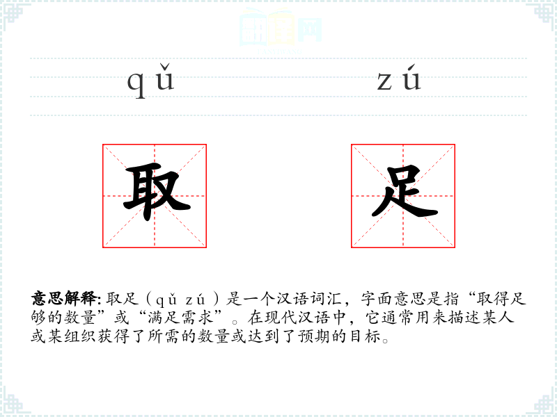 取足(qǔ zú)是一个汉语词汇,字面意思是指“取得足够的数量”或“满足需求”。在现代汉语中,它通常用来描述某人或某组织获得了所需的数量或达到了预期的目标。