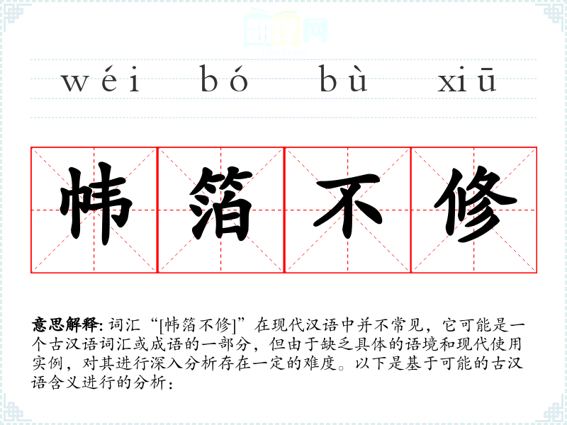 词汇“[帏箔不修]”在现代汉语中并不常见,它可能是一个古汉语词汇或成语的一部分,但由于缺乏具体的语境和现代使用实例,对其进行深入分析存在一定的难度。以下是基于可能的古汉语含义进行的分析: