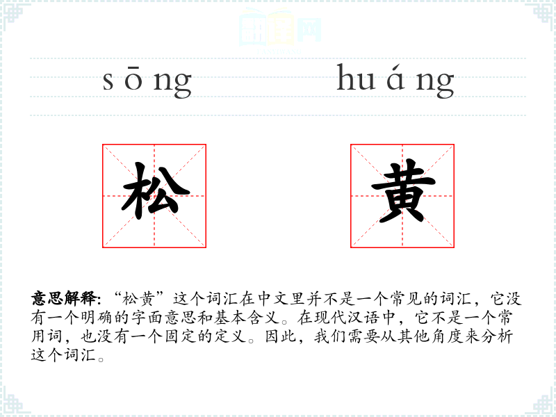 “松黄”这个词汇在中文里并不是一个常见的词汇,它没有一个明确的字面意思和基本含义。在现代汉语中,它不是一个常用词,也没有一个固定的定义。因此,我们需要从其他角度来分析这个词汇。