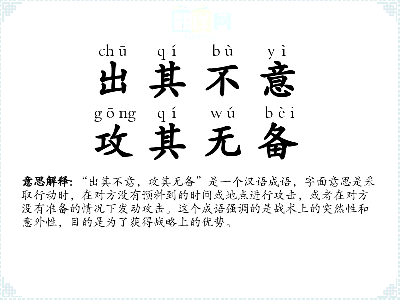 “出其不意,攻其无备”是一个汉语成语,字面意思是采取行动时,在对方没有预料到的时间或地点进行攻击,或者在对方没有准备的情况下发动攻击。这个成语强调的是战术上的突然性和意外性,目的是为了获得战略上的优势。