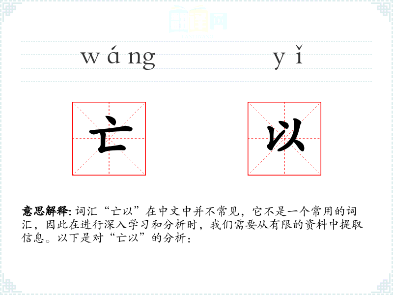 词汇“亡以”在中文中并不常见,它不是一个常用的词汇,因此在进行深入学习和分析时,我们需要从有限的资料中提取信息。以下是对“亡以”的分析: